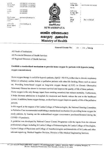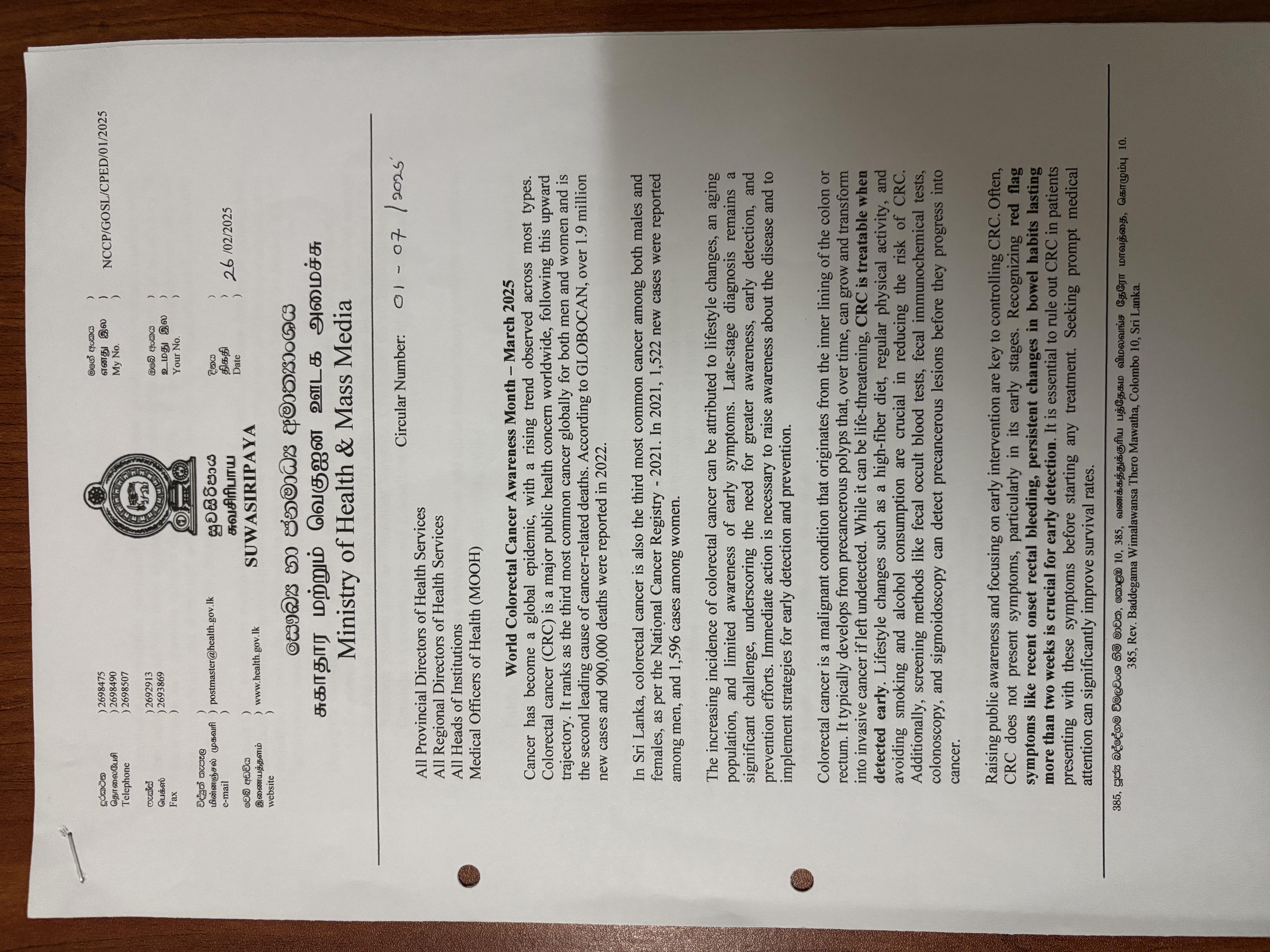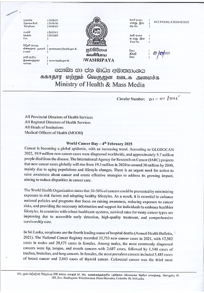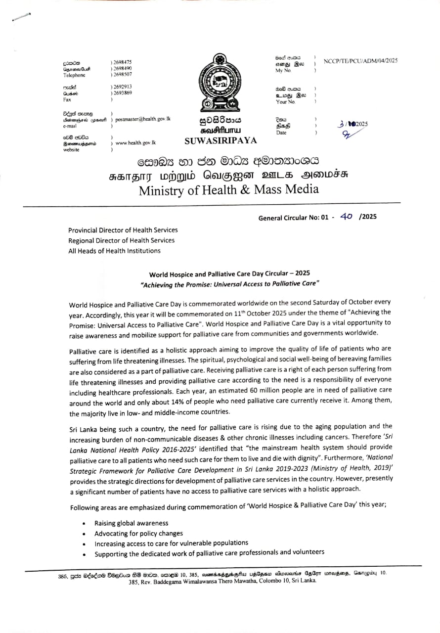The circular on “World Hospice and Palliative Care Day – 2025” is issued by the Ministry of Health in order to commemorate the day and provides directives for healthcare professionals to organize activities that strengthen palliative care services in Sri Lanka in alignment with the theme of the day.