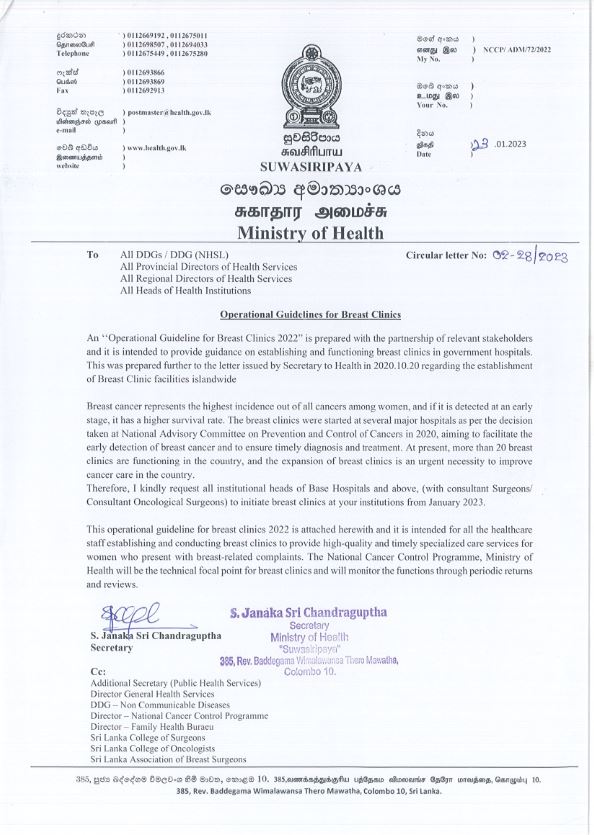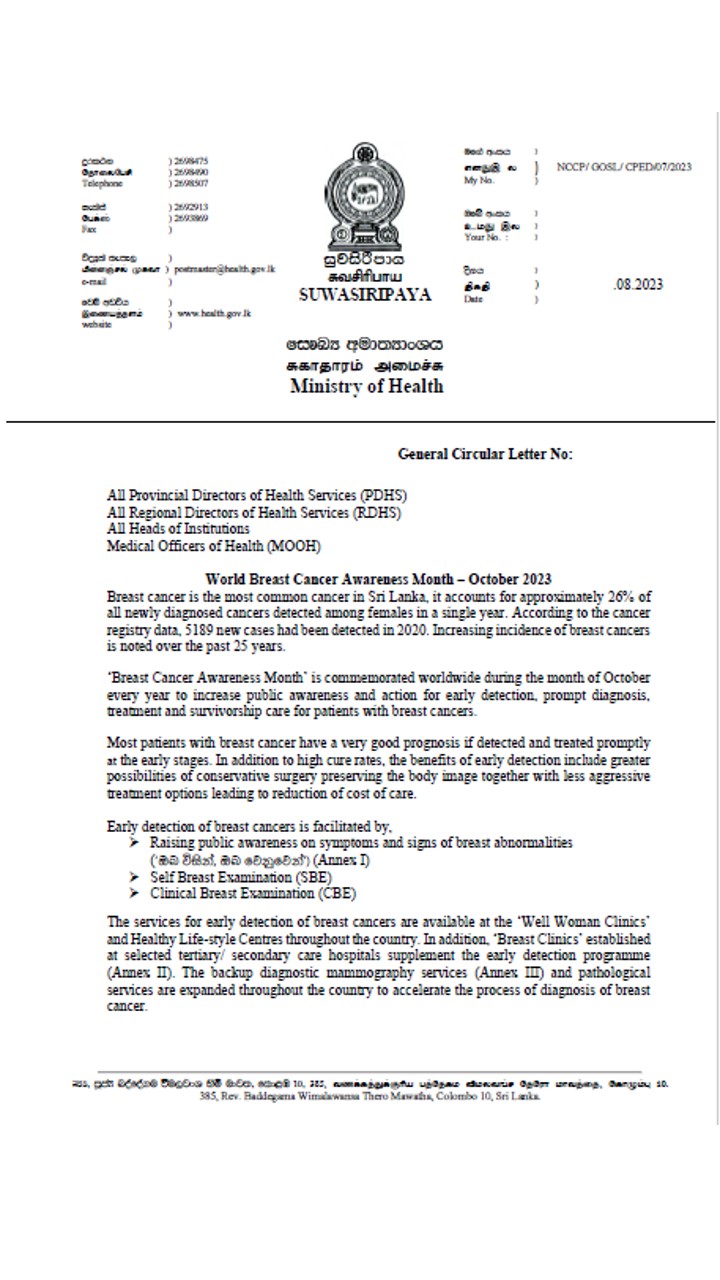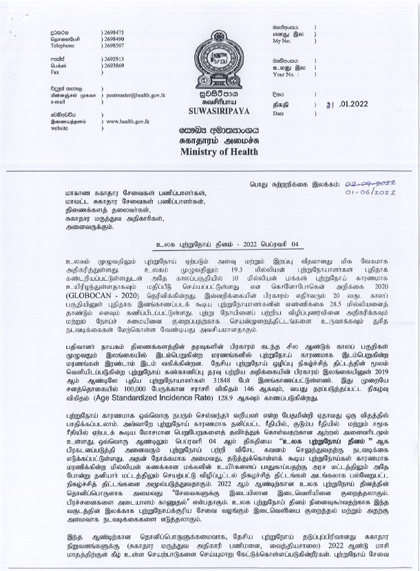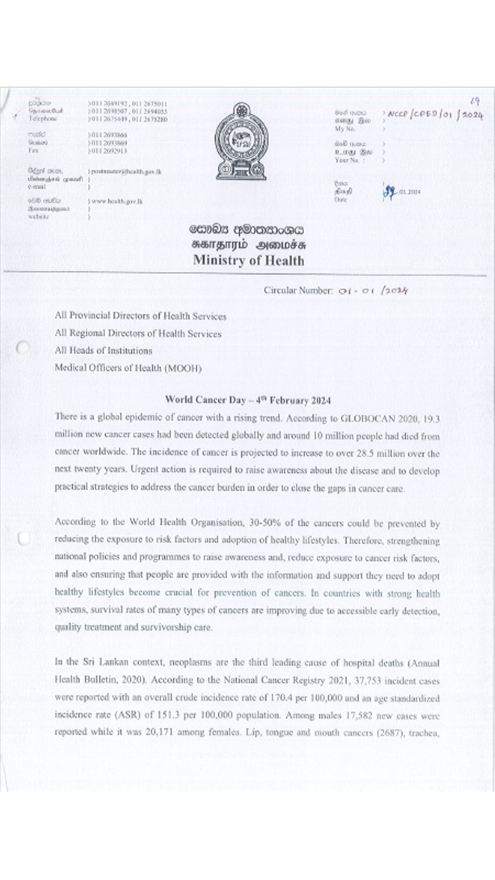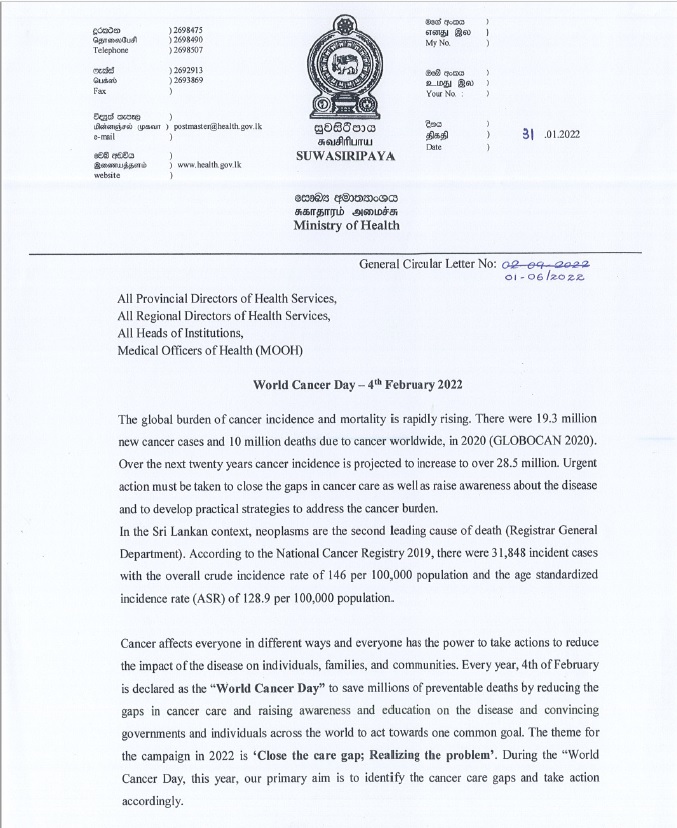 The circular on “World Hospice and Palliative Care Day – 2025” is issued by the Ministry of Health in order to commemorate the day and provides directives for healthcare professionals to organize activities that strengthen palliative care services in Sri Lanka in alignment with the theme of the day.