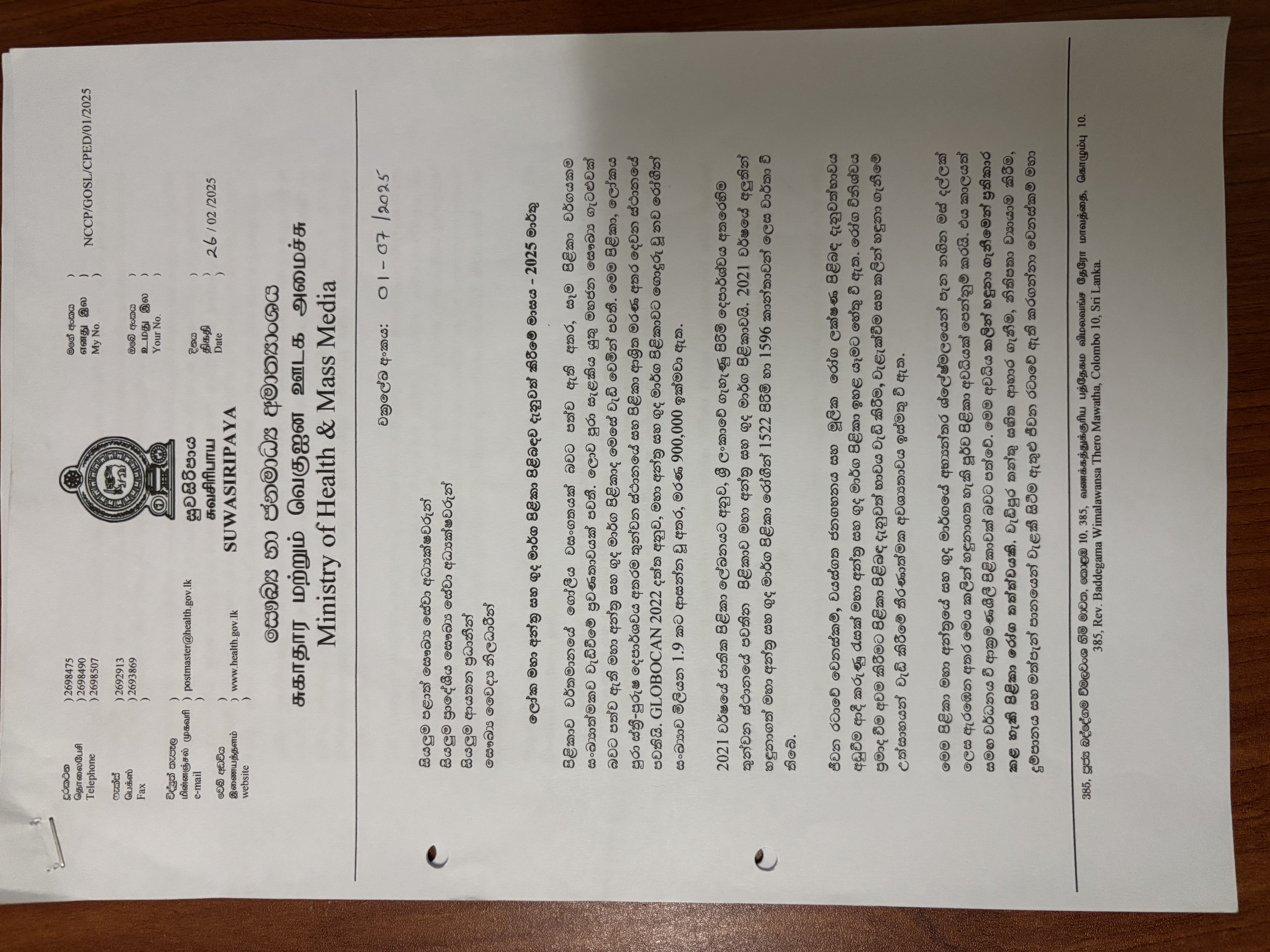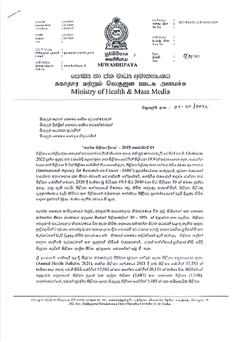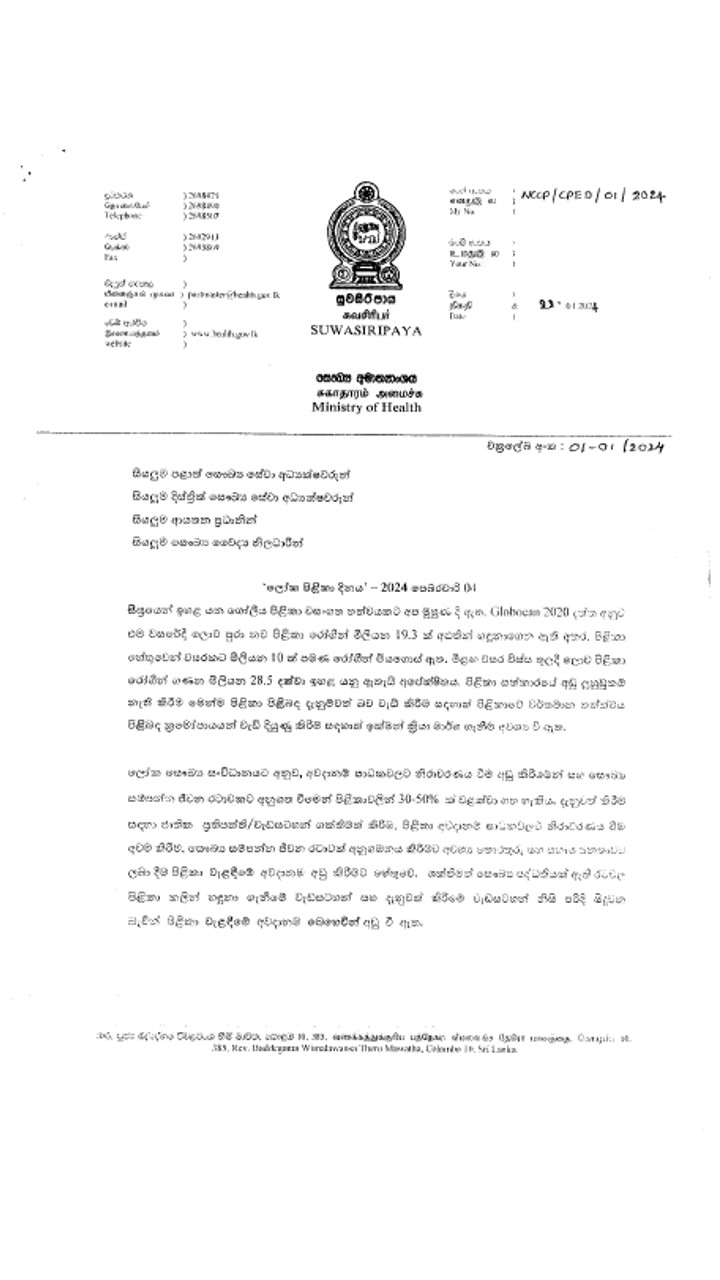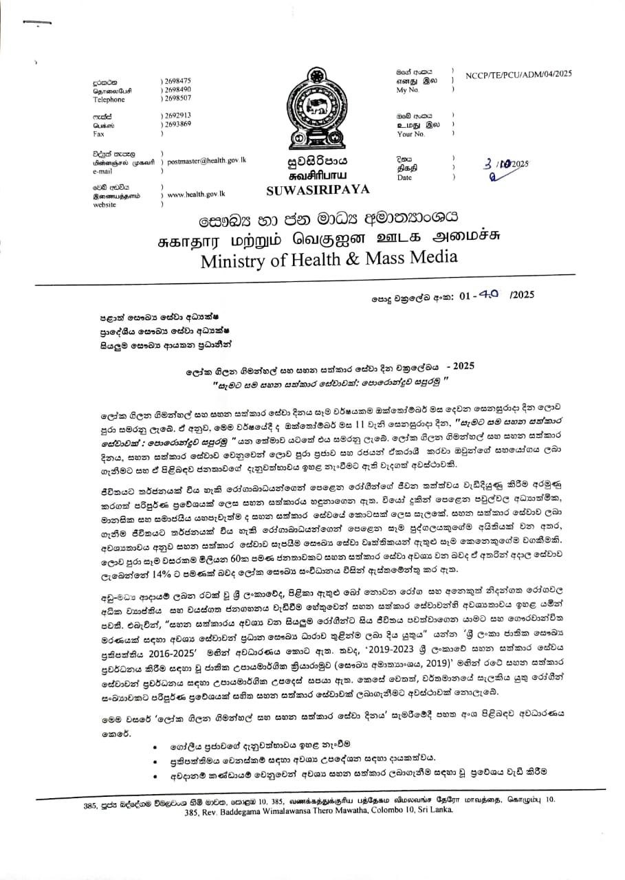 The circular on “World Hospice and Palliative Care Day – 2025” is issued by the Ministry of Health in order to commemorate the day and provides directives for healthcare professionals to organize activities that strengthen palliative care services in Sri Lanka in alignment with the theme of the day.