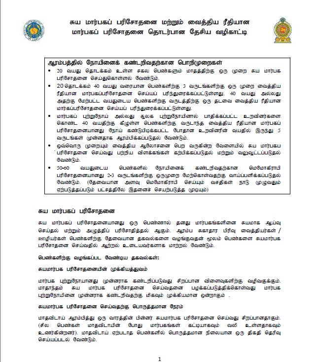 சுய மார்பகப் பரிசோதனை மற்றும் வைத்திய ரீதியான மார்பகப்பரிசோதனை - தேசிய வழிகாட்டி.