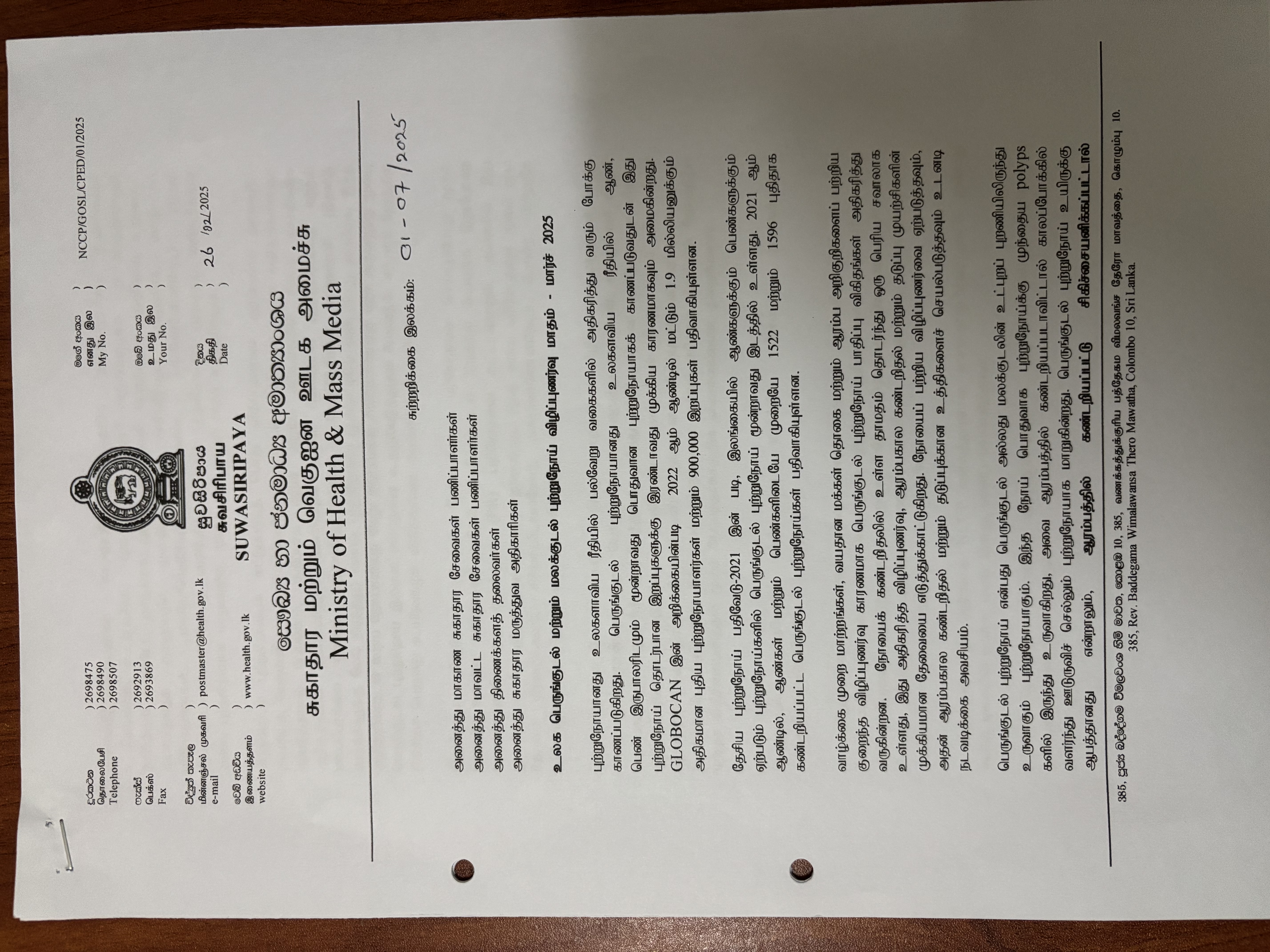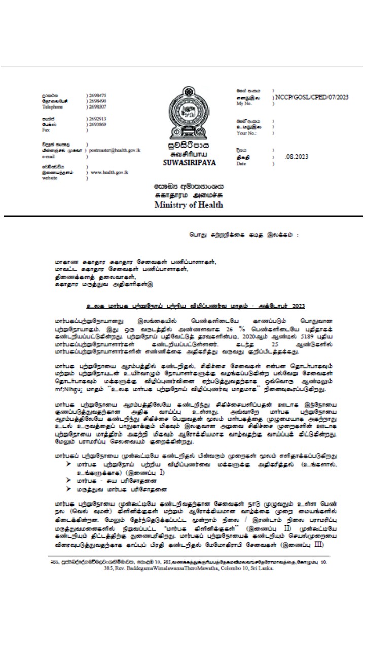 உலக மற்றும் இலங்கையின் மார்பகப் புற்றுநோய் பற்றிய ஒரு சுற்றறிக்கை ,இதில் நடைமுறைப் போக்கினை பற்றி அறிந்து கொள்ளலாம்.