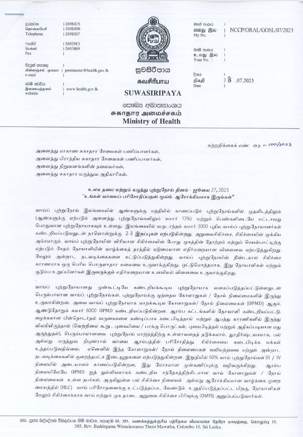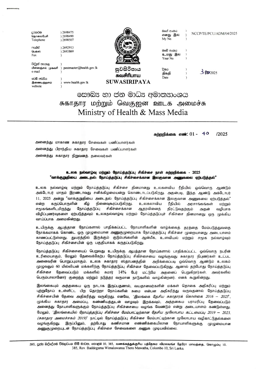 The circular on “World Hospice and Palliative Care Day – 2025” is issued by the Ministry of Health in order to commemorate the day and provides directives for healthcare professionals to organize activities that strengthen palliative care services in Sri Lanka in alignment with the theme of the day.